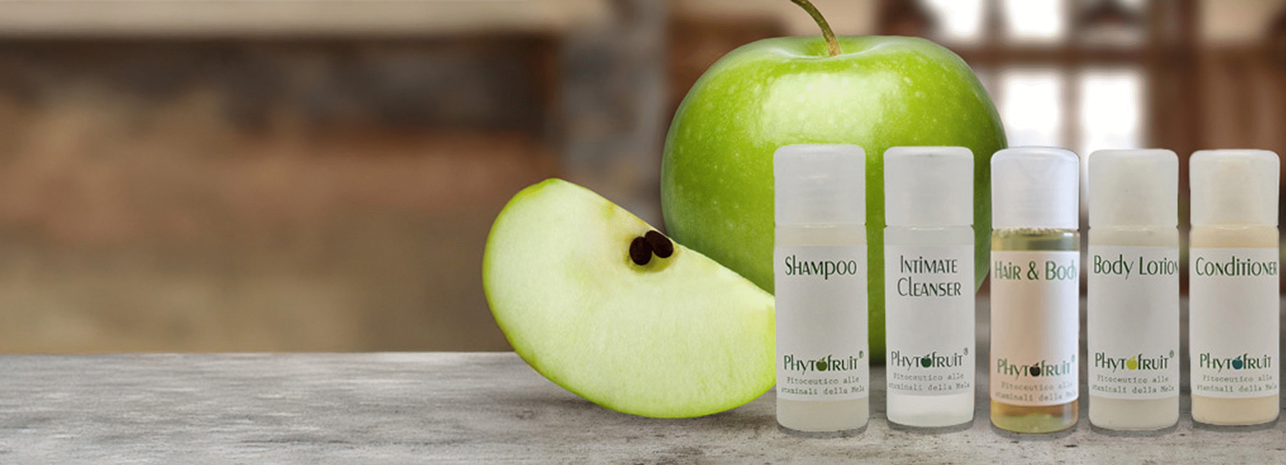 La linea PHYTOFRUIT è completata da articoli monouso confezionati in flow-pack di carta mela, materiale innovativo, riciclato e sostenibile, ideale per hotel, spa o set regalo naturali.