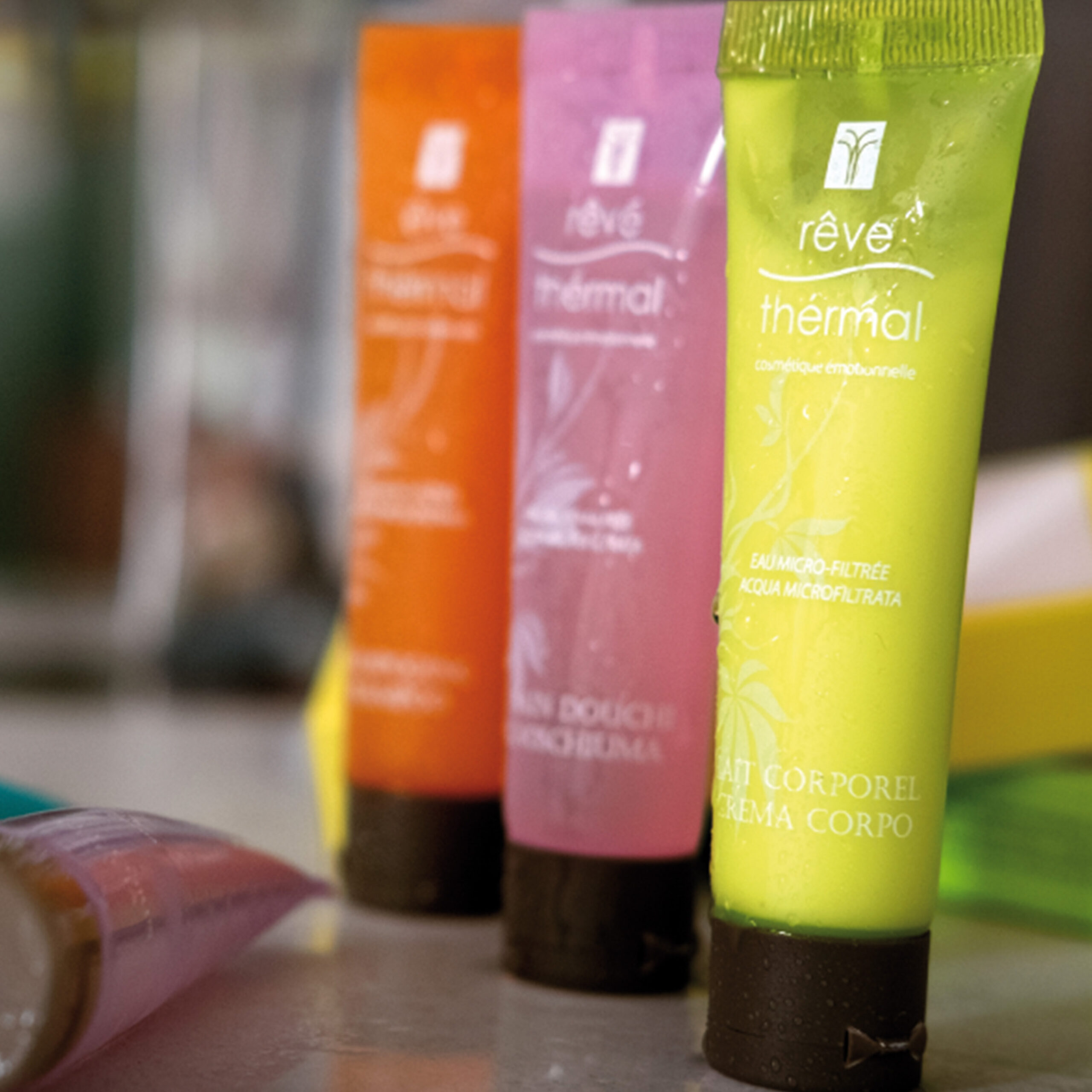 La Linea Reve Thermal è pensata per ambienti SPA e centri termali, ispirata agli elementi marini e termali. Grazie agli estratti di alga marina, offre un’esperienza cosmetica rigenerante, fresca e colorata.